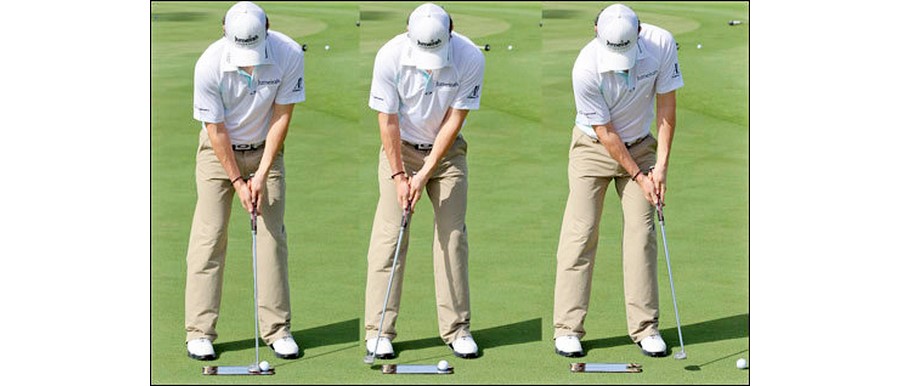 La main inférieure contrôle la trajectoire du ''putter'' et la main supérieure aide simplement à stabiliser le mouvement, ce qui rend l'action similaire à une pendule. Réalisez que le mouvement sera fait avec vos épaules, vos bras et vos poignets comme un système unique. Notez que les mains se déplaceront d'une jambe à l'autre, comme le démontre l'image ci-dessus.